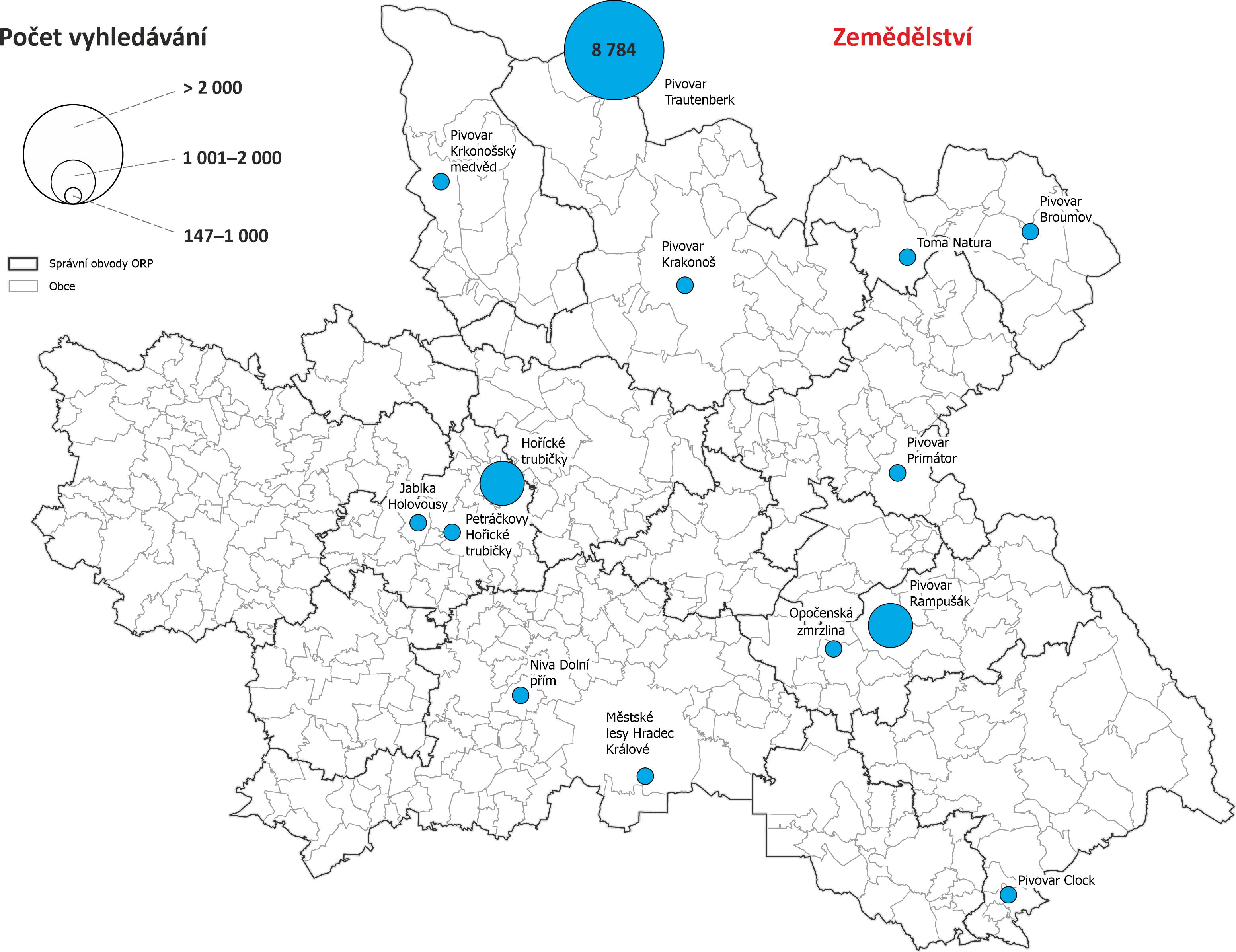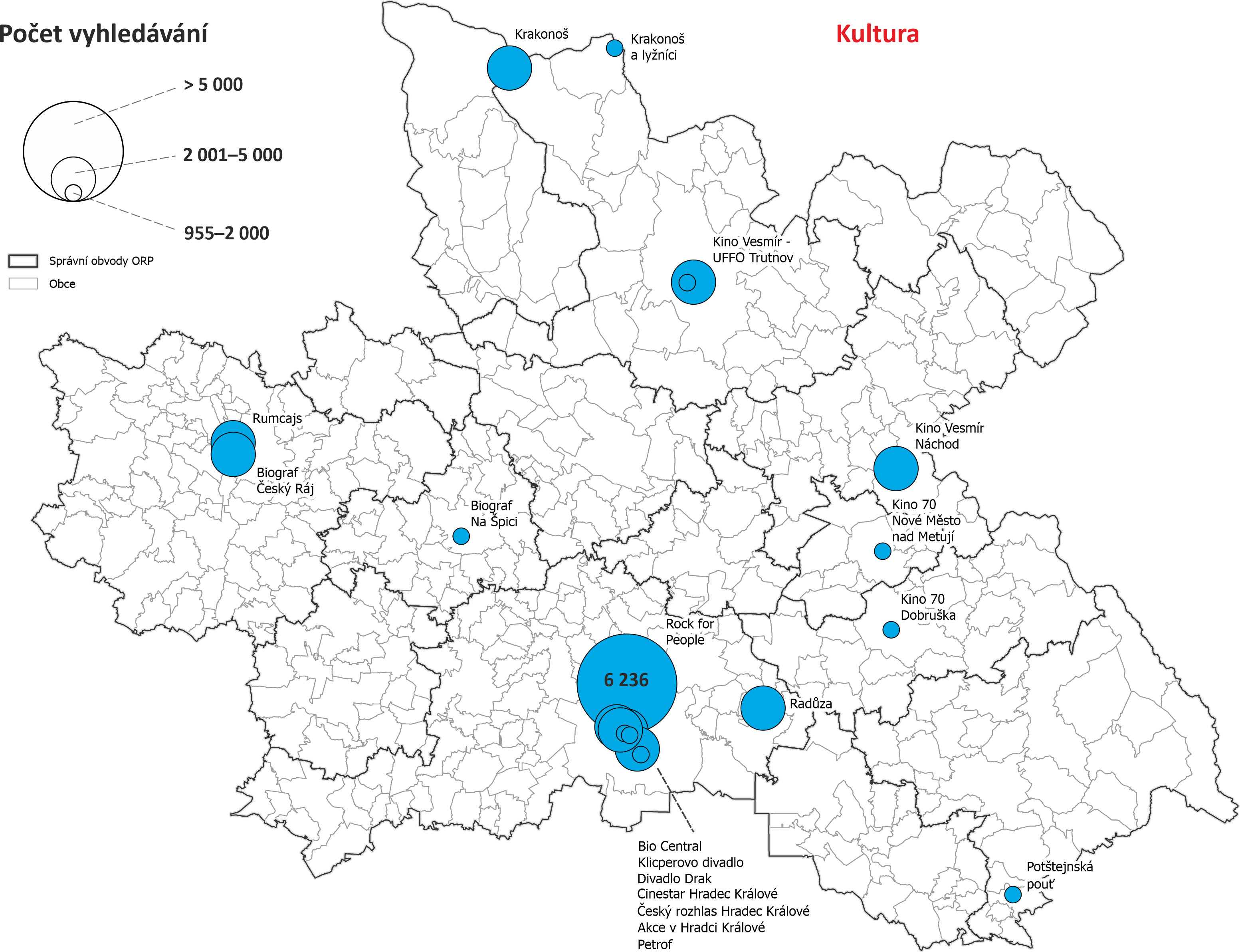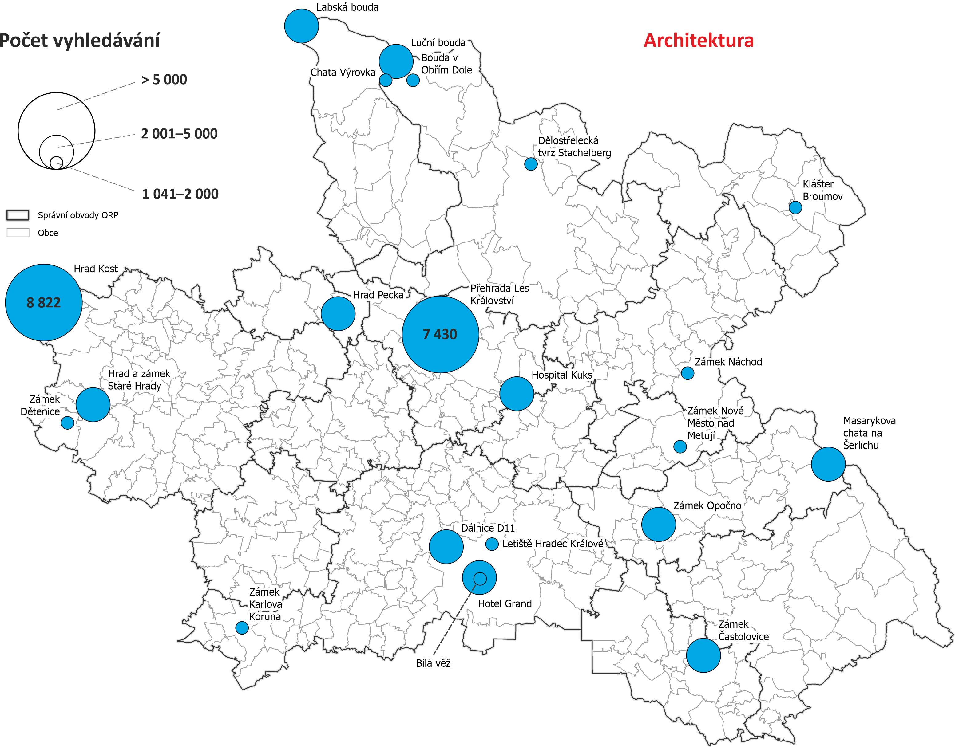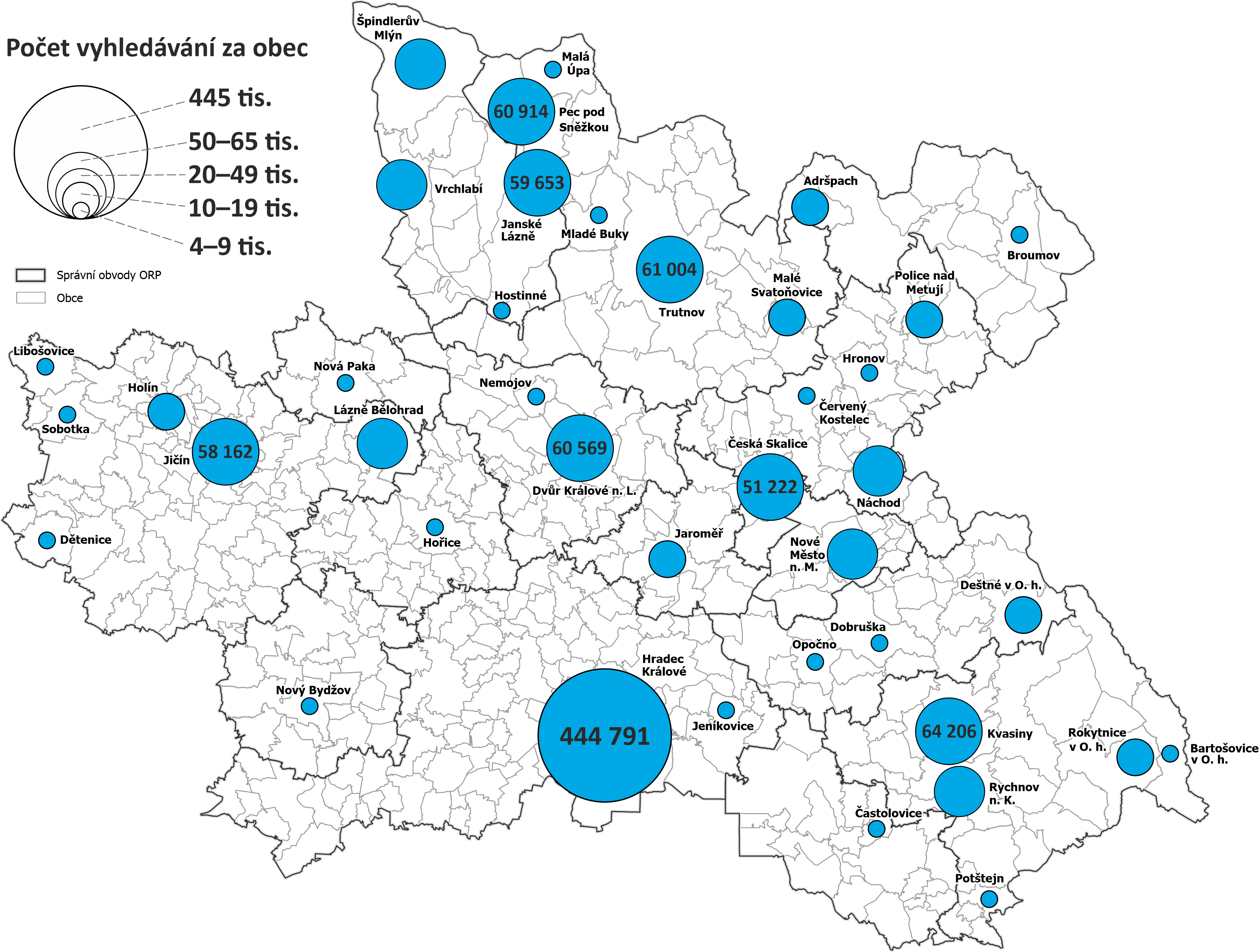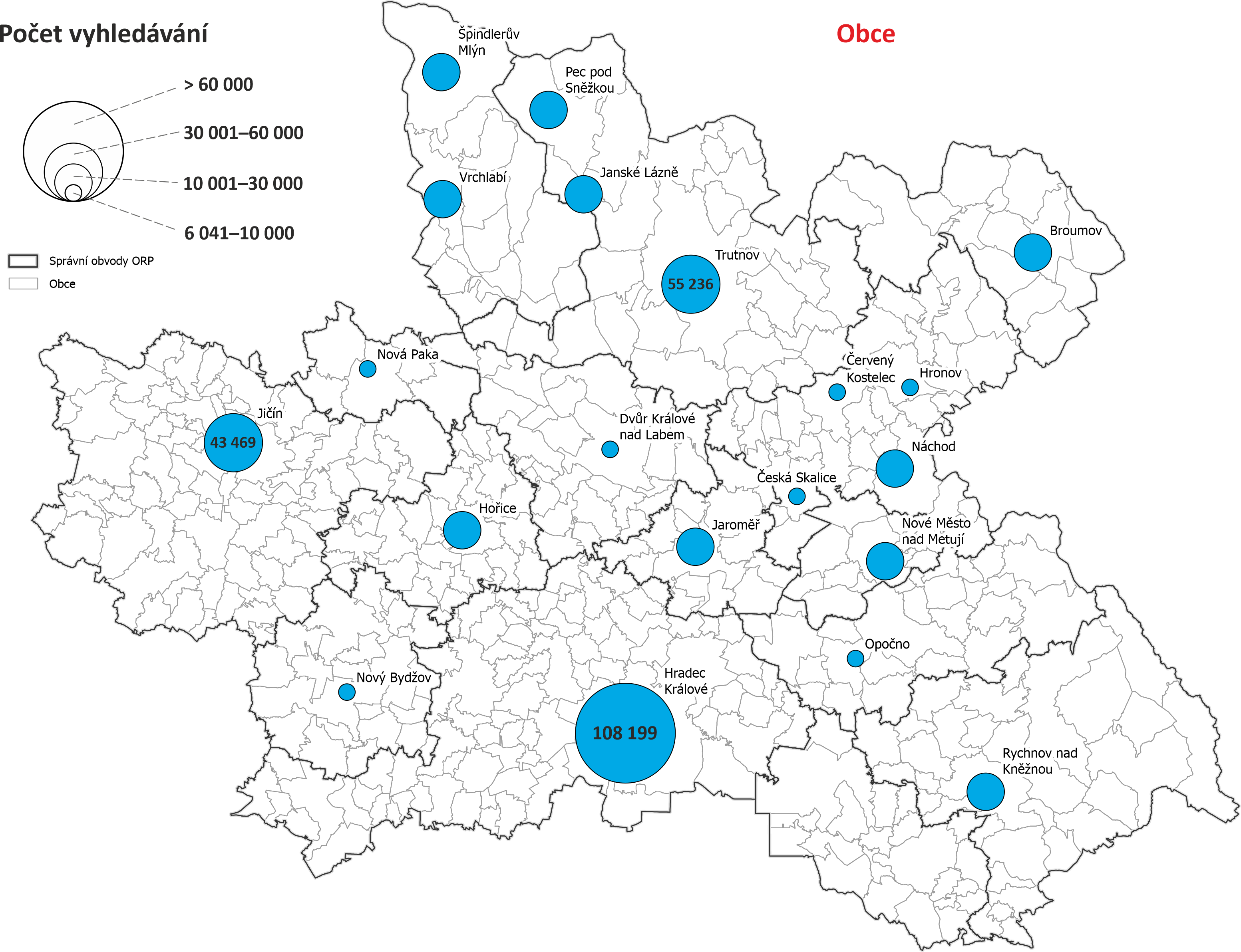 Mapy vyhledávání dle obcí Královéhradeckého kraje - počet vyhledávání objektů nacházejících se v dané obci nebo s obcí nějak spojených