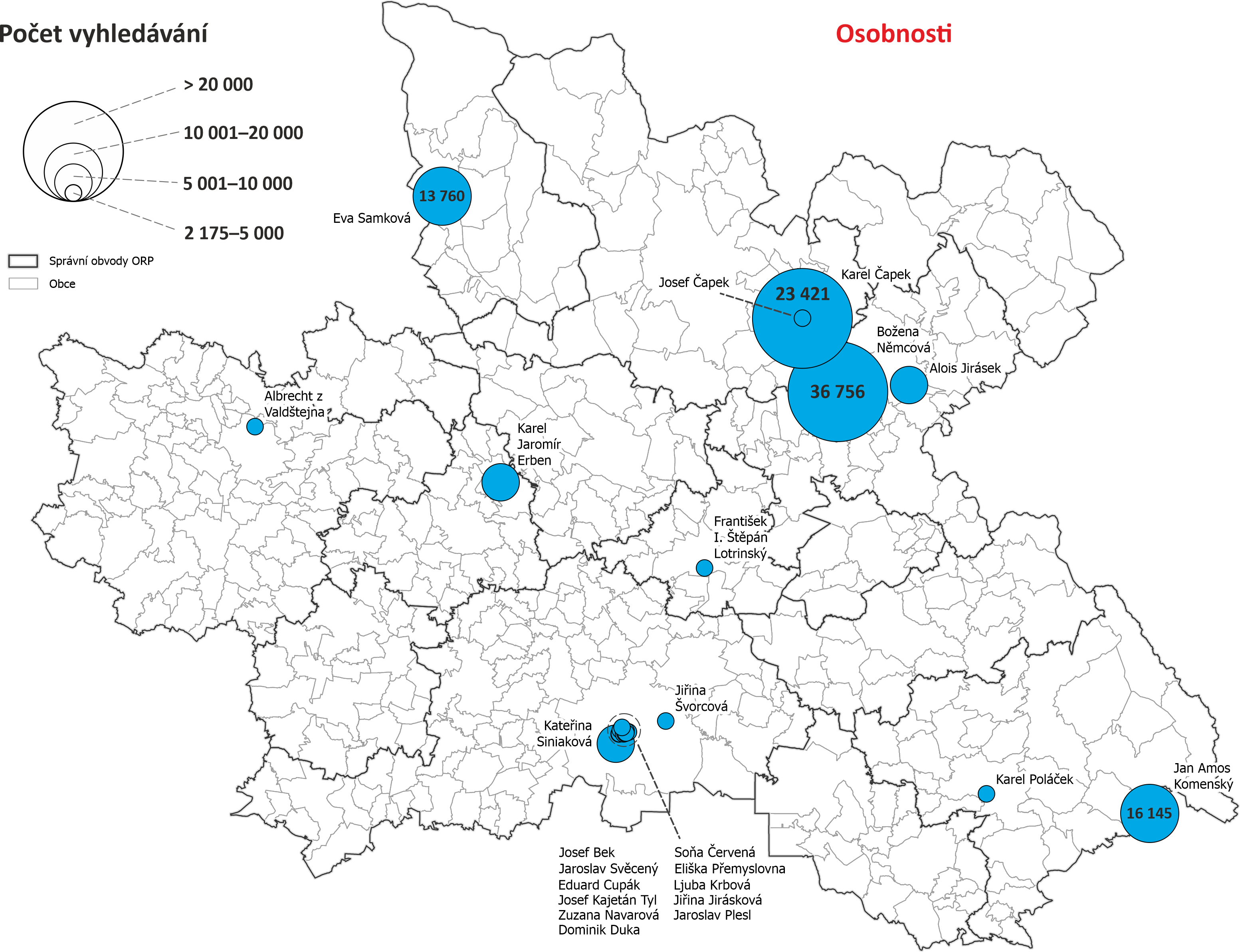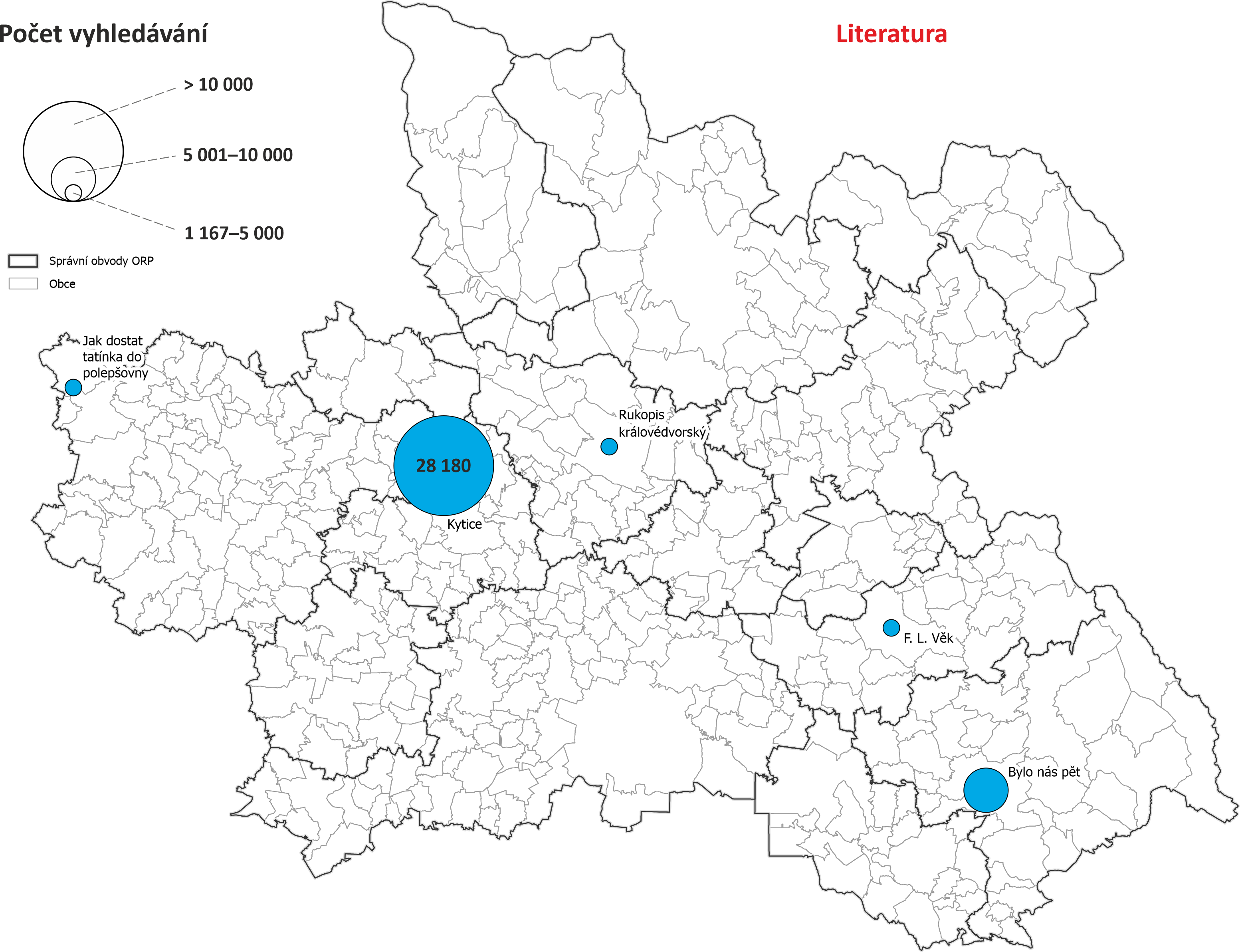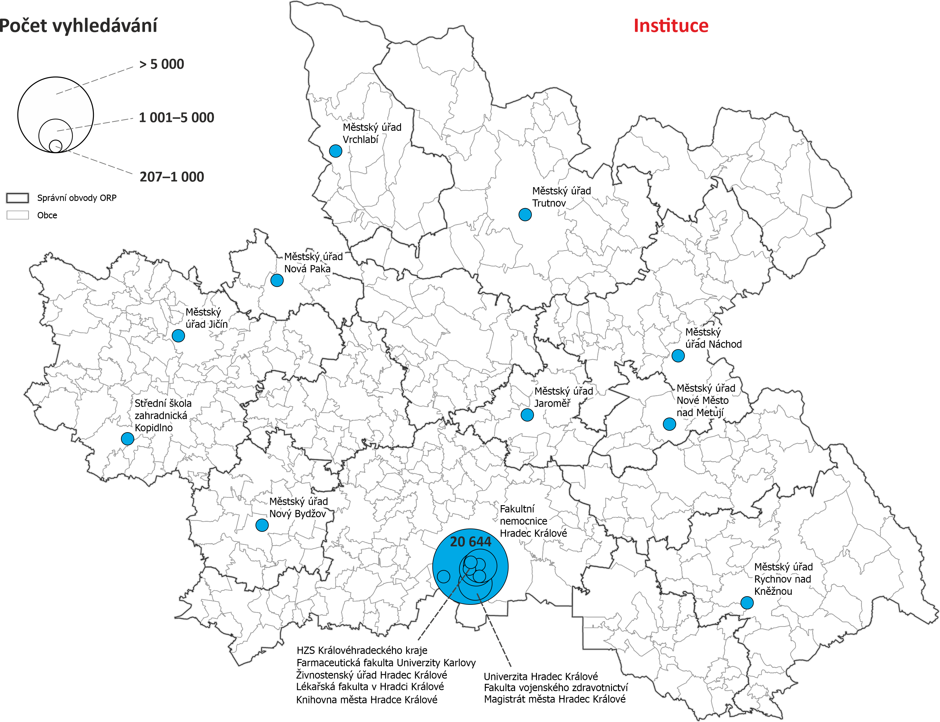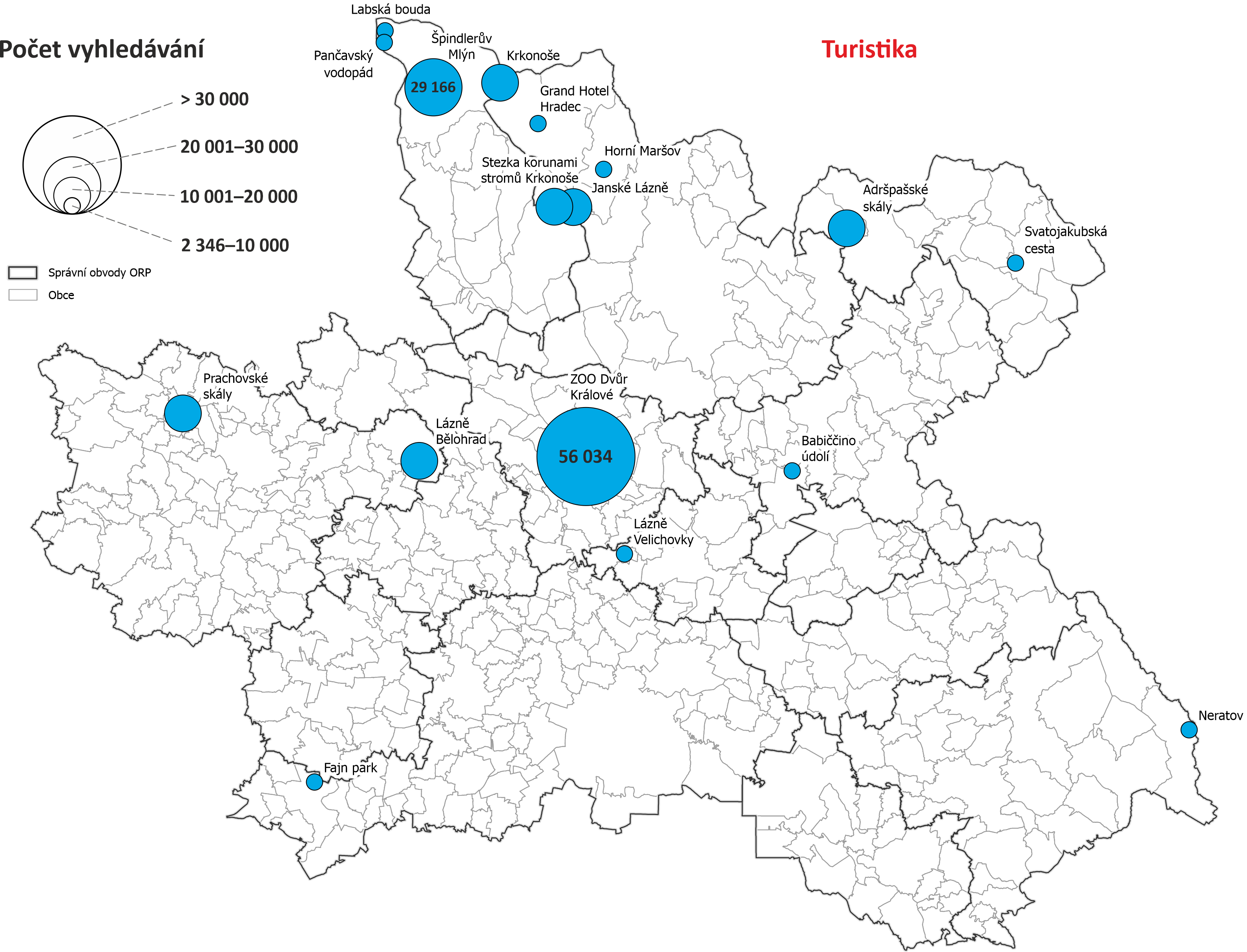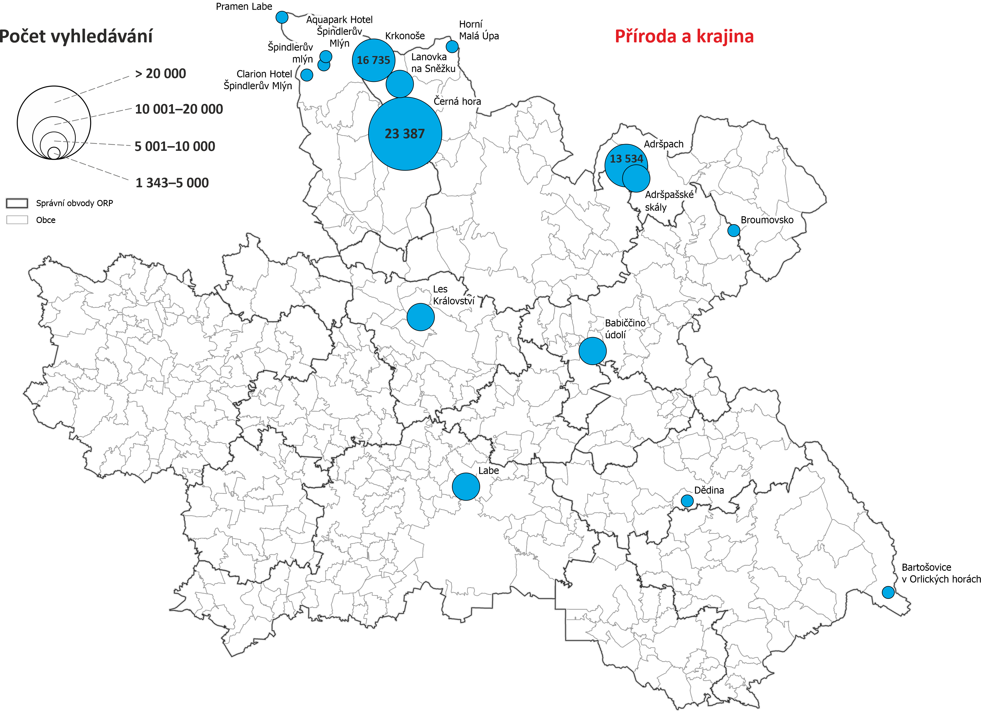 Mapy vyhledávání dle obcí Královéhradeckého kraje - počet vyhledávání objektů nacházejících se v dané obci nebo s obcí nějak spojených